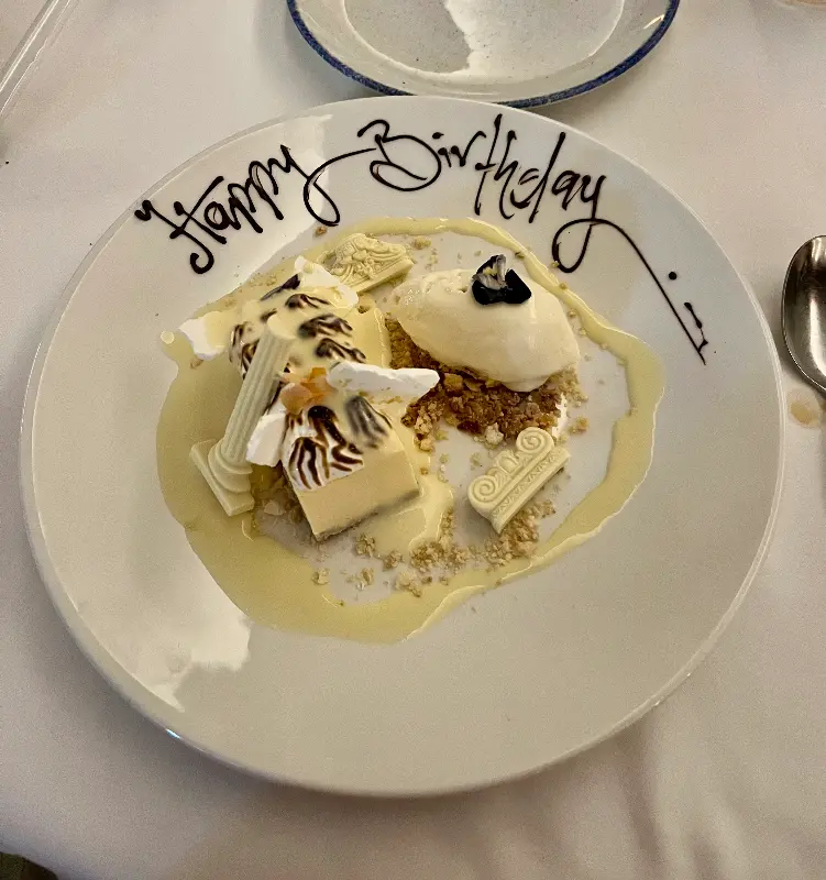 생일 기념으로 방문한 OPA Doha에서는 특별한 디저트가 준비되었다. “Happy Birthday”라는 문구가 적힌 아름다운 디저트는 눈과 입을 즐겁게 했다. 달콤한 맛과 섬세한 장식은 특별한 날을 더욱 특별하게 만들어주었다.