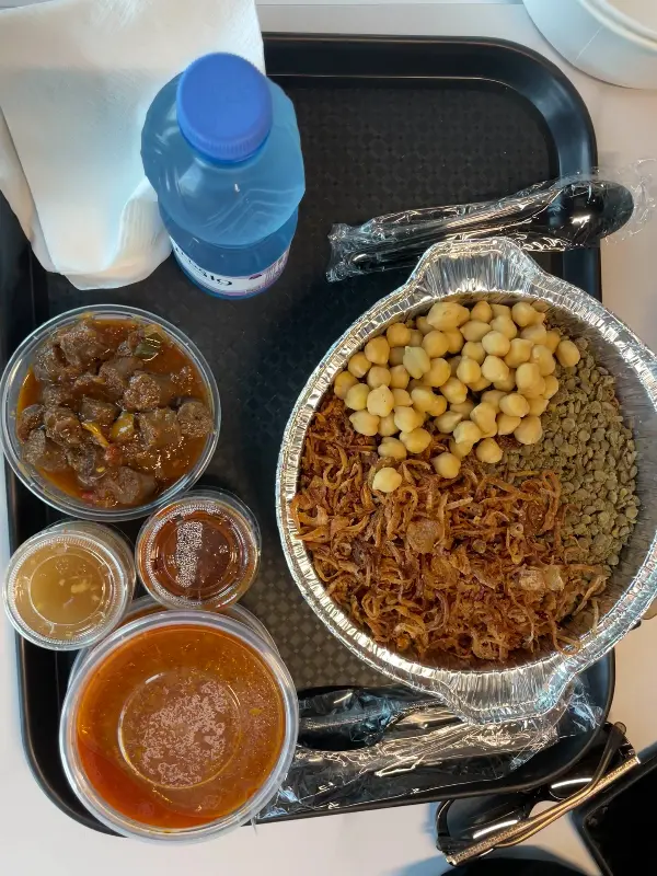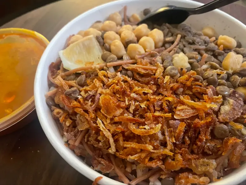 코샤리는 밥, 면, 콩, 토마토 소스, 튀긴 양파 등이 어우러진 이집트의 대표적인 길거리 음식이다. 코샤리 엘 타흐리르의 코샤리는 한눈에 보기에도 재료들의 조화가 훌륭해 보였다. 렌틸콩의 고소함, 쌀의 담백함, 마카로니의 쫄깃함, 그리고 바삭한 튀긴 양파의 조화는 입안에서 다채로운 식감을 선사했다.