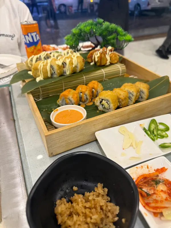 일본 뷔페에 대한 아쉬움도 있었습니다. 새벽 3시까지 일본 음식을 제공한다고 안내받았지만, 1시 45분에 방문했을 때 이미 일본 음식 코너가 정리되어 있었습니다. 롤 종류가 다양하지 않았고, 밥의 비중이 높은 점도 아쉬웠습니다. 하지만 직원들의 친절한 서비스와 신선한 생선 덕분에 긍정적인 인상을 받을 수 있었습니다. 다음 방문에는 일본 음식을 제대로 즐길 수 있기를 기대합니다.