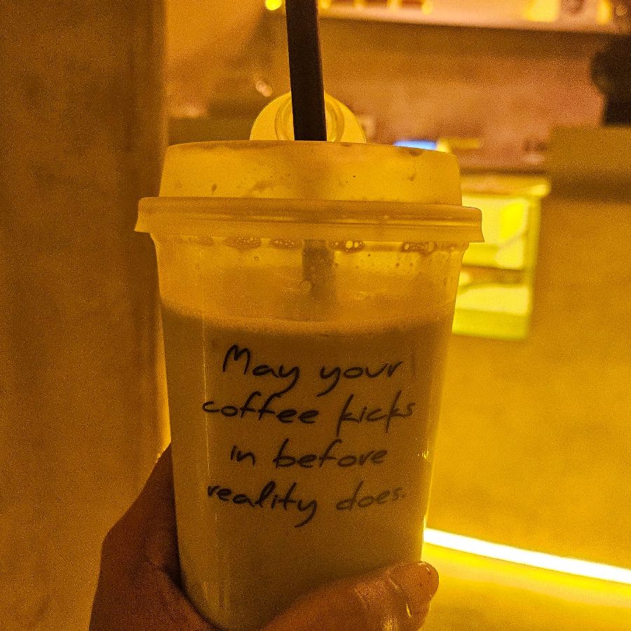 한편, 커피를 팔지 않는다는 점은 논알코올 음료를 선호하는 이들에게는 아쉬움으로 남았습니다. 진한 맥주 향 가득한 펍에서 씁쓸한 커피 한 잔을 기대했던 이들에게는 다소 이색적인 경험으로 다가왔을 것입니다. 대신, “현실이 닥치기 전에 커피가 힘을 발휘하길”이라는 위트 있는 문구가 적힌 테이크아웃 컵에 담긴 독특한 음료는, 이곳이 단순히 술만 파는 곳이 아니라 방문객들의 다양한 기호를 이해하려는 노력을 하고 있음을 보여주는 듯했습니다.