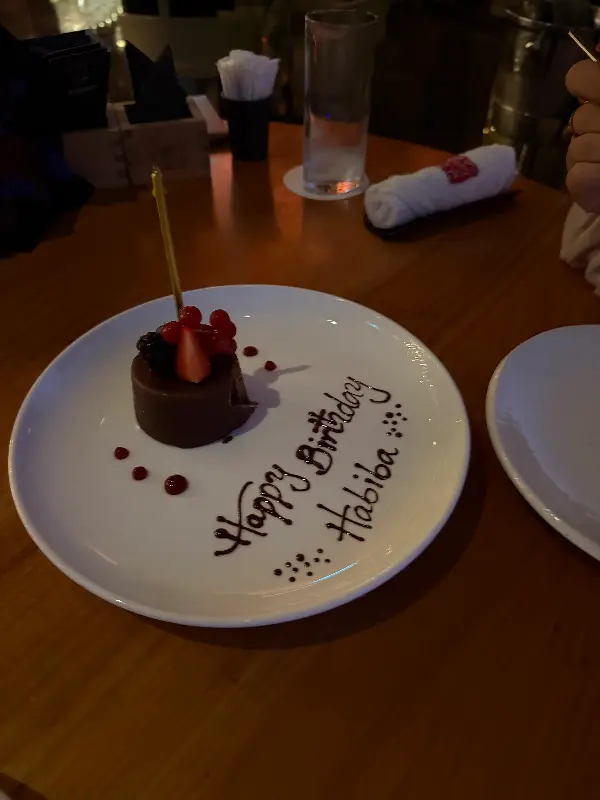 생일이나 기념일과 같은 특별한 날에 방문하는 고객에게는 더욱 특별한 경험이 제공됩니다. 필립 총괄 매니저가 직접 방문하여 축하 인사를 전하고, 케이크를 선물하는 등의 깜짝 이벤트는 고객에게 깊은 감동을 선사합니다. 이러한 개인적인 관심과 배려는 고객과의 유대감을 강화하고, 모리모토를 단순한 레스토랑이 아닌, 소중한 추억을 공유하는 공간으로 만들어줍니다. 이미지에서 볼 수 있듯이, “Happy Birthday Habiba”라는 문구가 적힌 디저트는 그 정성과 따뜻함을 시각적으로 보여줍니다.