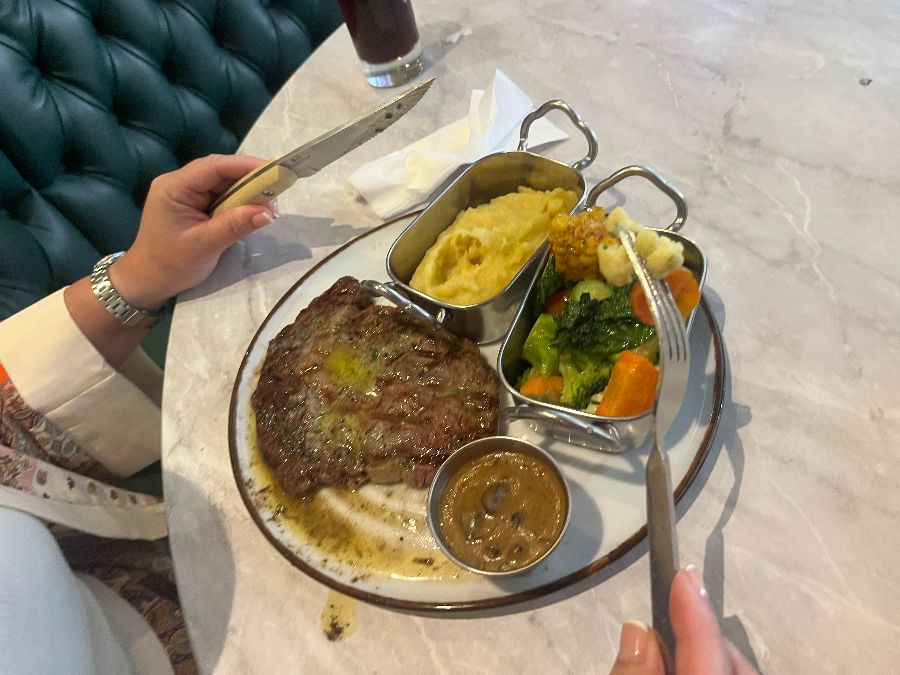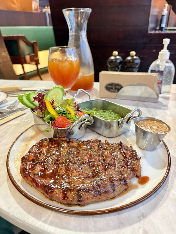 드디어 메인 요리인 스테이크가 등장합니다. 접시 위에 놓인 스테이크는 완벽한 그릴 마크와 먹음직스러운 윤기로 시각적인 만족감을 선사합니다. 특히 이곳의 굽기 기술은 단골들이 칭찬을 아끼지 않는 부분입니다. 미디엄 웰을 주문해도 다른 곳처럼 웰던이 아닌, 육즙을 머금은 촉촉함이 살아있는 미디엄 웰로 정확히 구워져 나옵니다. 등심 스테이크는 미디엄 레어로 주문 시 버터 없이도 육즙이 풍부하고 부드러운 식감을 자랑하며, 입안 가득 퍼지는 고소한 육향은 감탄사를 자아냅니다. 호주산 립아이 스테이크 역시 ‘인생 스테이크’라는 극찬이 아깝지 않을 정도로 훌륭한 맛을 선사합니다.