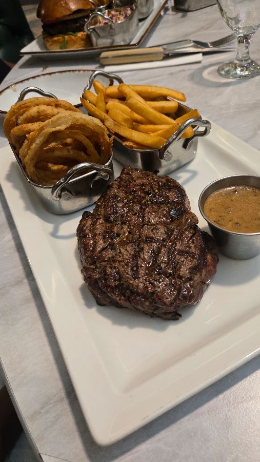 스테이크와 함께 제공되는 사이드 디쉬 또한 이 미식 경험을 완성하는 중요한 요소입니다. 버섯 소스는 정말 맛있어서 스테이크의 풍미를 한층 끌어올려 주며, 퀴노아 샐러드는 신선하고 풍미 가득한 맛으로 훌륭한 균형을 이룹니다. 바삭하게 튀겨진 감자튀김과 고소한 어니언 링은 스테이크의 든든한 동반자가 되어줍니다.