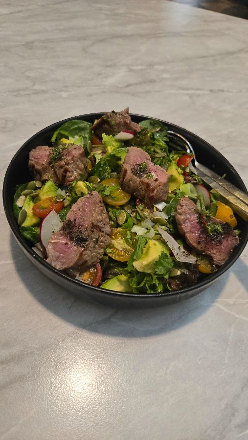 건강한 맛을 선호하는 이들을 위한 메뉴도 잊지 않았습니다. 신선한 채소와 완벽하게 구워진 스테이크 큐브가 풍성하게 담긴 샐러드는 맛과 영양을 동시에 잡은 훌륭한 선택입니다. 다채로운 색감의 채소들과 촉촉한 고기의 조화는 눈으로도 즐거운 경험을 선사합니다.