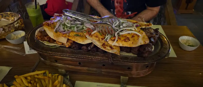 다른 날 저녁, 다시 데저트 로즈를 찾았다. 이번에는 테라스에 자리를 잡고 믹스 그릴을 주문했다. 해가 지고 선선한 바람이 불어오는 저녁, 야외 테라스는 더욱 낭만적인 분위기를 자아냈다. 잠시 후, 숯불 향이 은은하게 풍기는 믹스 그릴이 테이블에 놓였다.