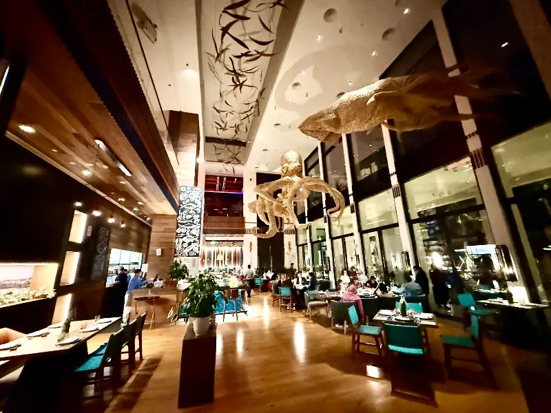인터컨티넨탈 호텔의 탁 트인 해변 분위기가 레스토랑 전체를 감싸 안는 듯했다. 독특한 문어와 물고기 조형물들은 시각적인 즐거움을 더하며, 공간에 활기를 불어넣었다. 미슐랭 선정 레스토랑임을 알리는 표지판은 이곳이 단순한 식당이 아닌, 미식 경험을 선사하는 특별한 공간임을 암시했다.