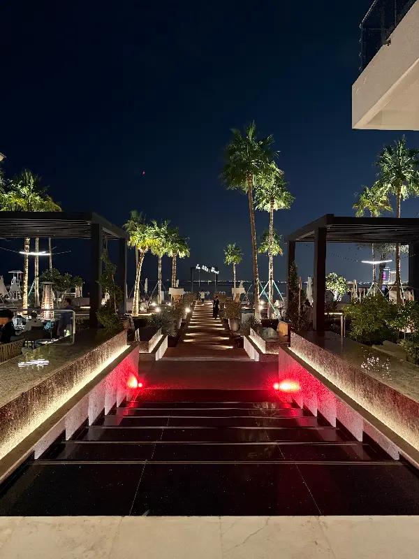 레스토랑 내부는 파란색과 흰색 풍선으로 장식되어 있어 마치 지중해 연안에 와있는 듯한 착각을 불러일으켰다. 은은하게 퍼지는 조명 아래, 테이블마다 놓인 작은 캔들은 아늑하고 로맨틱한 분위기를 더했다. 특히 밤이 되면 조명이 켜진 야외 테라스는 더욱 매력적이었다. 야자수가 줄지어 서 있는 해변을 바라보며 즐기는 식사는 그야말로 환상적일 것 같았다.