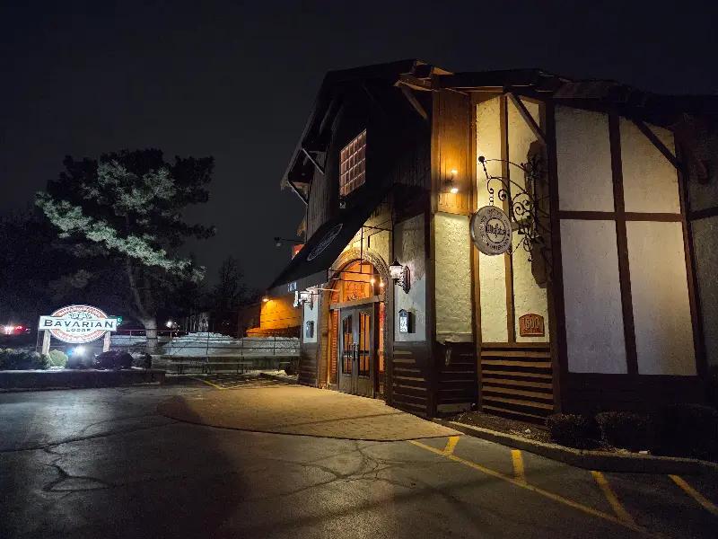 외부는 고풍스러운 목조 건물로, 어두운 밤에도 따뜻하게 빛나는 조명이 시선을 사로잡는다. 마치 시간을 거슬러 올라간 듯한 분위기는, 맛있는 식사에 대한 기대감을 한껏 높여준다. 건물 옆에 세워진 “BAVARIAN LODGE” 간판은 이곳이 정통 독일 음식점임을 알려주는 듯하다.
