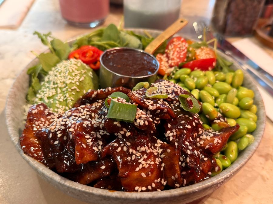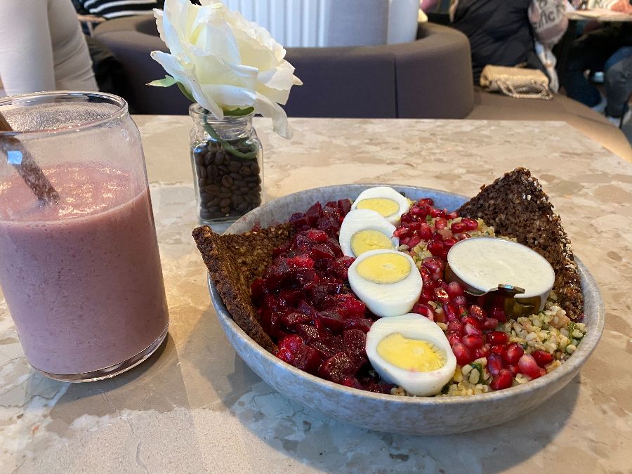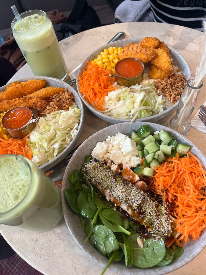 이곳의 가장 큰 매력 중 하나는 바로 독일에서는 좀처럼 찾아보기 힘든 신선하고 건강한 메뉴들입니다. 소시지와 고기 위주의 독일 음식에 지쳤다면, ONE Nation Munich는 마치 사막의 오아시스처럼 상큼하고 활력 넘치는 식사를 제공합니다. 메뉴판을 넘기는 순간, 다채로운 색감의 ‘볼(Bowl)’ 요리들이 시선을 사로잡습니다. 이곳의 모든 음식은 갓 수확한 듯 신선한 재료로 만들어지며, 단순히 맛있을 뿐 아니라 예술 작품처럼 아름답게 플레이팅되어 나옵니다. 음식 하나하나에 정성을 다하는 손길이 느껴져, 식사 전부터 기대감을 한껏 높입니다. 비건 요리나 비건으로 변경 가능한 메뉴가 많다는 점, 그리고 비건 단백질 스무디까지 갖추고 있어 채식주의자들에게도 더없이 반가운 소식입니다.