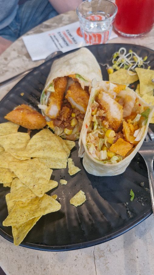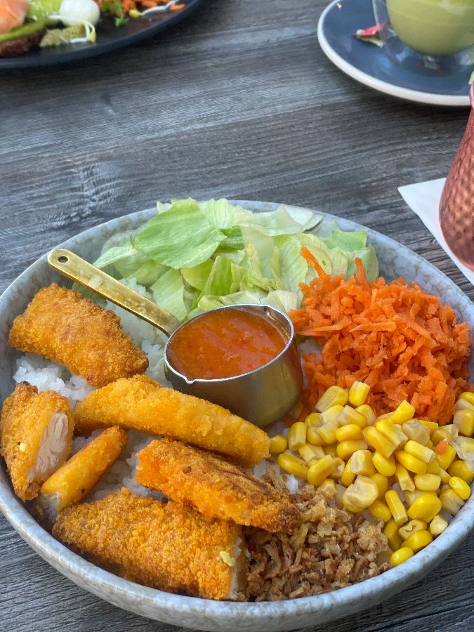 든든하면서도 건강한 식사를 원한다면, 이곳의 치킨 랩과 치킨 볼은 탁월한 선택이 될 것입니다. 특히 한국식 바비큐 치킨 랩은 매콤달콤한 칠리소스와 바삭한 치킨 너겟, 신선한 채소가 어우러져 이국적이면서도 익숙한 맛의 조화를 이룹니다. 한 손에 들고 먹기 좋게 반으로 잘라 나온 랩은 속이 꽉 차 있어 보기만 해도 푸짐합니다. 옆에 함께 나오는 바삭한 나초칩은 랩의 풍미를 더욱 돋워주며, 입안 가득 퍼지는 고소함과 씹는 재미를 더해줍니다. 치킨 볼 역시 밥 위에 바삭하게 튀겨낸 치킨 너겟, 아삭한 양배추, 달콤한 옥수수, 그리고 넉넉하게 뿌려진 튀긴 양파 후레이크와 칠리소스가 어우러져 한 그릇 가득 풍성함을 자랑합니다. 신선한 채소와 단백질, 탄수화물의 완벽한 균형을 이루며, 건강하면서도 만족스러운 한 끼를 제공합니다. 팔라펠 볼 또한 특유의 이국적인 향신료 맛과 담백함이 어우러져 매력적입니다.