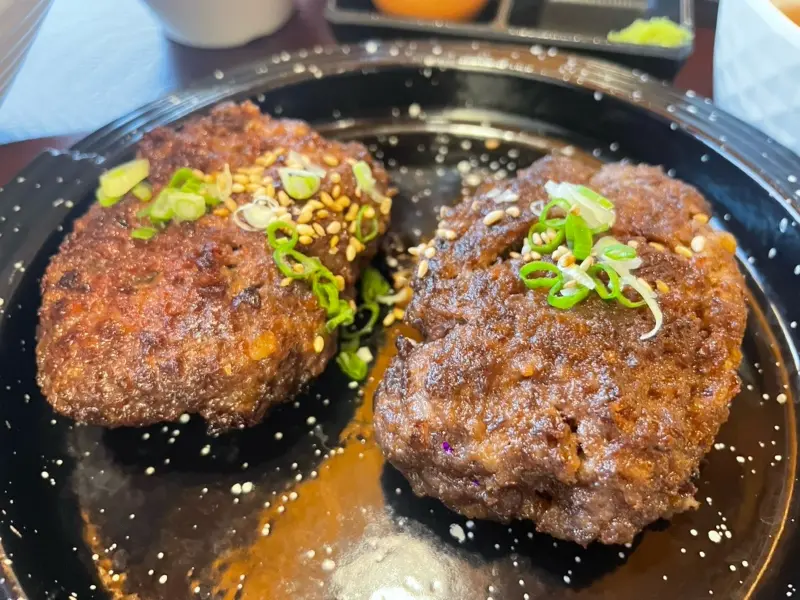 육즙 가득한 함박스테이크, 윤기가 자르르 흐르는 모습이 식욕을 자극합니다.