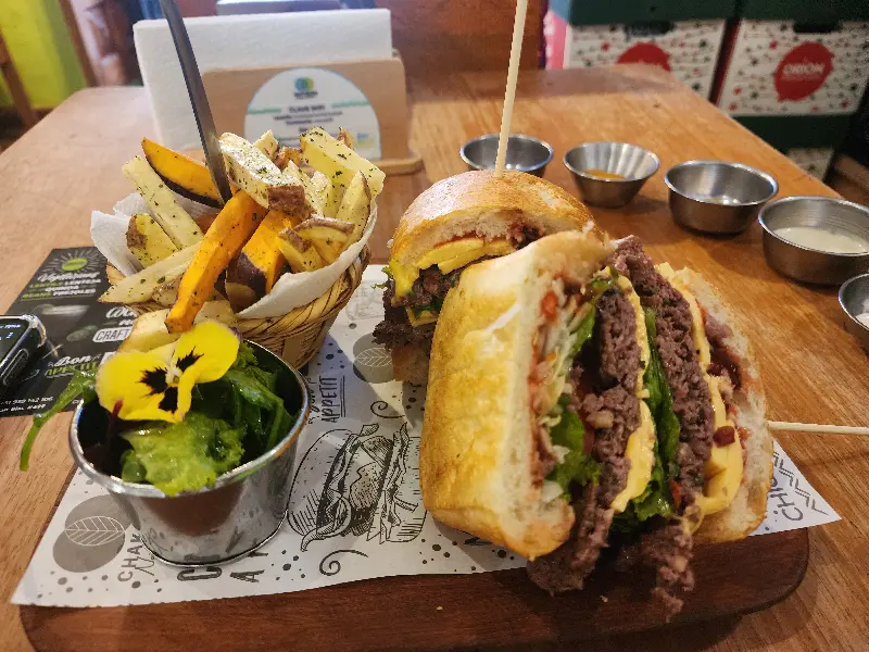 나무 도마 위에 놓인 더블 알파카 버거와 곁들임 메뉴의 조화.