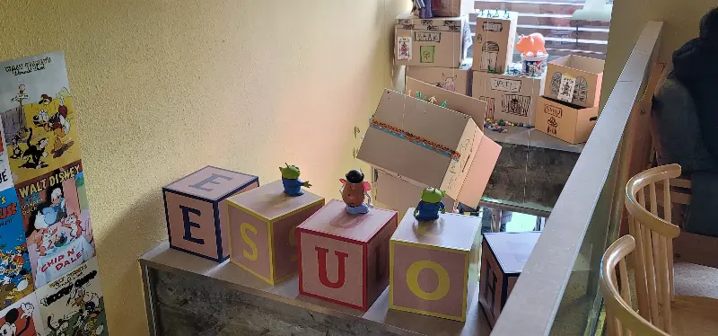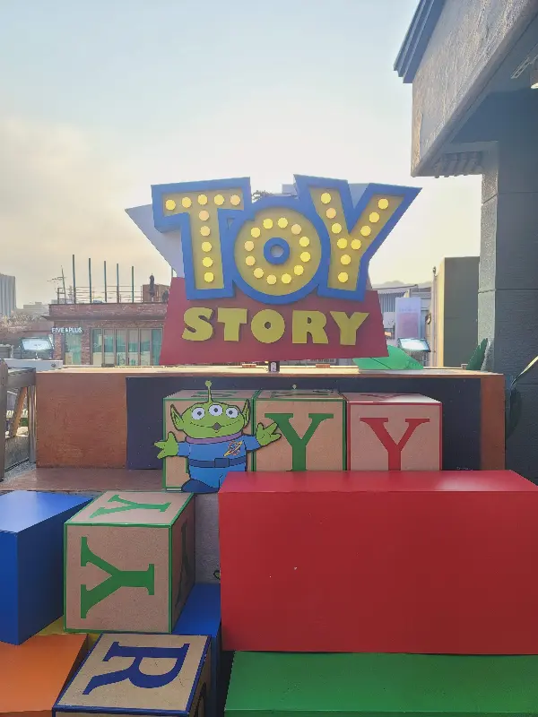 곳곳에 놓인 토이스토리 캐릭터 인형들과 장난감들은 어린 시절 추억을 떠올리게 했습니다. 사진에서처럼 “ESUO” 블록 위에 앙증맞은 외계인 피규어가 올려져 있는 디테일은 정말 감탄스러웠습니다. 디즈니를 좋아하지 않더라도, 충분히 매력적인 공간이라고 생각합니다.