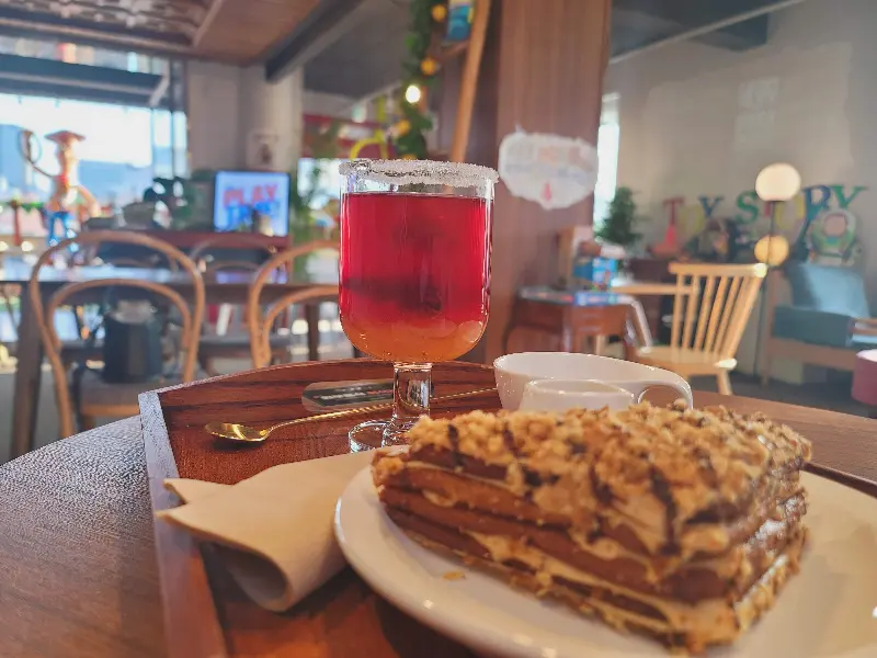 1층에서 간단한 쇼핑을 마치고 2층 카페로 올라갔습니다. 2층은 마치 ‘토이스토리’ 속 에디의 방을 그대로 옮겨 놓은 듯한 모습이었어요. 알록달록한 색감과 아기자기한 소품들이 시선을 사로잡았습니다.