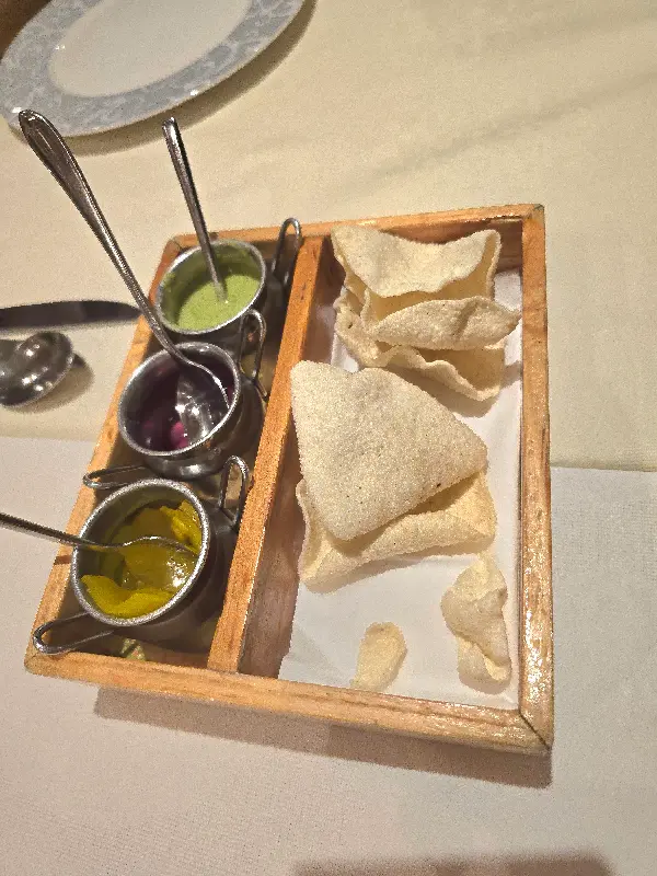다양한 소스와 함께 제공되는 인도 전통 빵. 빵 자체의 풍미도 훌륭하지만, 소스와 함께 곁들이면 더욱 다채로운 맛을 즐길 수 있습니다.