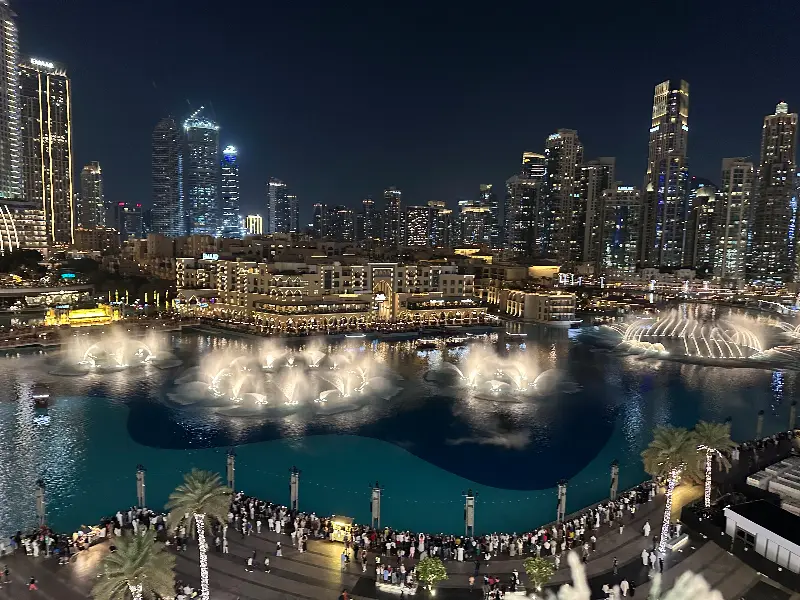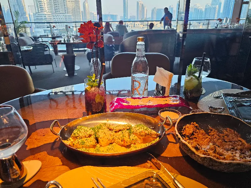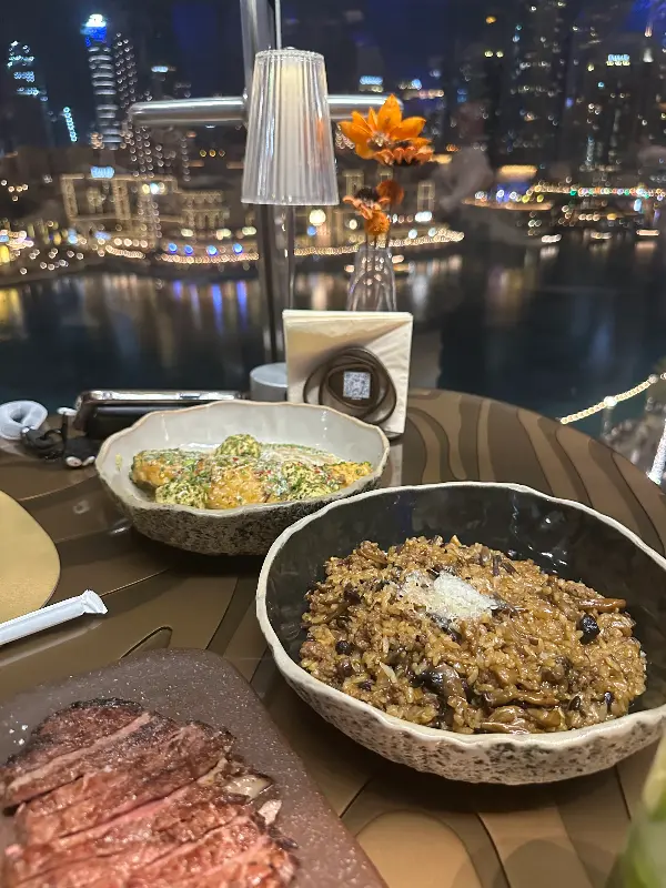 예약 덕분인지 분수쇼가 한눈에 보이는 좋은 자리로 안내받았다. 하지만 아쉽게도 방문 당시 분수 광장이 공사 중이라 화려한 쇼는 볼 수 없었다. 외부 테라스 자리가 아닌 실내 좌석으로 배정받아 아쉬움이 남았다는 후기도 있었지만, 직원들의 친절한 서비스 덕분에 금세 기분이 좋아졌다. 특히 우리 테이블을 담당했던 Shafqat은 불편함 없이 편안하게 식사를 즐길 수 있도록 세심하게 배려해 주었다.