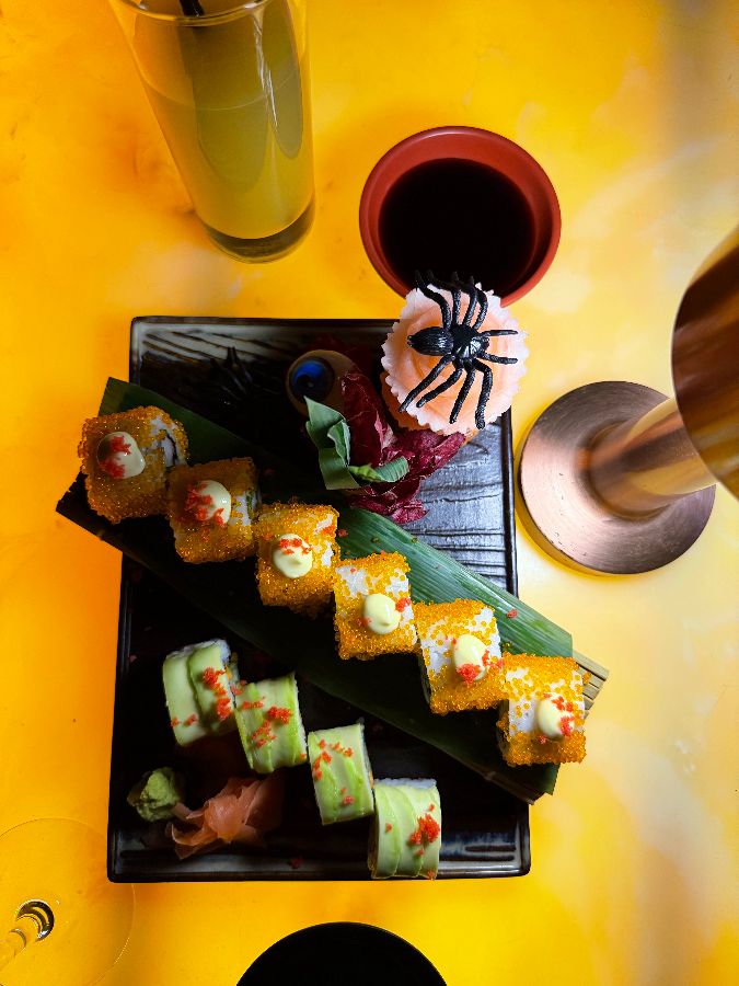 특히 핼러윈 같은 특별한 시기에는 거미 장식의 디저트와 함께 제공되는 화려한 마키는 그야말로 시각적인 즐거움의 극치를 보여줍니다. 주황색 날치알과 하얀 소스가 어우러져 마치 예술 작품처럼 느껴지는 이 마키들은 칸파이가 제공하는 특별한 경험의 일부입니다. 톡톡 터지는 날치알의 식감과 부드러운 소스의 조화는 입안에서 황홀경을 선사합니다.