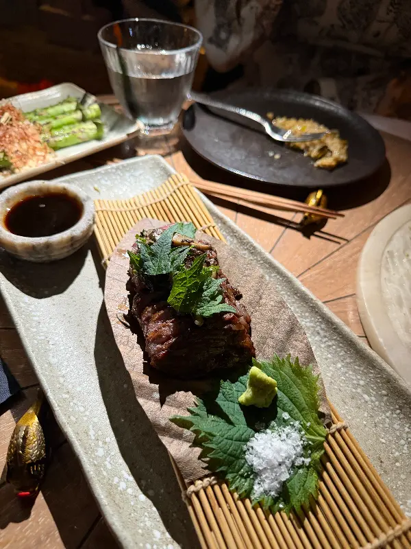 메인 코스로는 스테이크 요리를 선택했습니다. 육즙 가득한 스테이크 위에 신선한 채소가 듬뿍 올려져 있었고, 스테이크 아래에는 윤기가 자르르 흐르는 소스가 깔려 있었습니다. 칼로 스테이크를 자르는 순간, 부드러운 육질이 그대로 느껴졌습니다. 한 입 베어 물자, 입안 가득 퍼지는 풍부한 육즙과 고소한 풍미가 황홀경을 선사했습니다. 겉은 바삭하고 속은 촉촉하게 구워진 완벽한 스테이크였습니다.