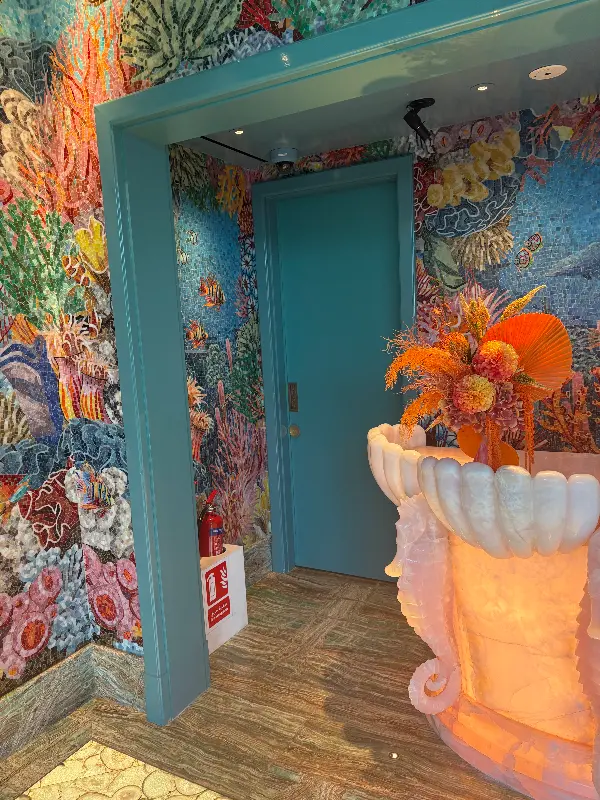 레스토랑 내부는 그야말로 디자인의 걸작이었습니다. 몽환적인 노을빛 조명 아래, 대담하고 예술적인 감각이 돋보이는 인테리어가 펼쳐졌습니다. 벽면을 장식한 현대 미술 작품들은 화려하면서도 따뜻한 분위기를 자아냈고, 곳곳에 배치된 오브제들은 시선을 사로잡았습니다. 마치 깊은 바닷속을 탐험하는 듯한 신비로운 느낌과 동시에 세련되고 고급스러운 분위기가 공존하는 공간이었습니다.