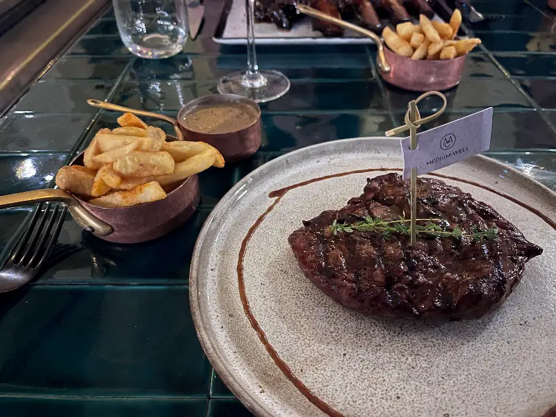 스테이크: The Meat Co.의 대표 메뉴인 스테이크는 꼭 맛봐야 할 메뉴입니다. 숯불 향이 은은하게 배어 있는 스테이크는 겉은 바삭하고 속은 촉촉하게 구워져 나옵니다. 육즙이 풍부하고 부드러운 식감이 일품이며, 함께 제공되는 소스와 곁들여 먹으면 더욱 풍성한 맛을 느낄 수 있습니다.