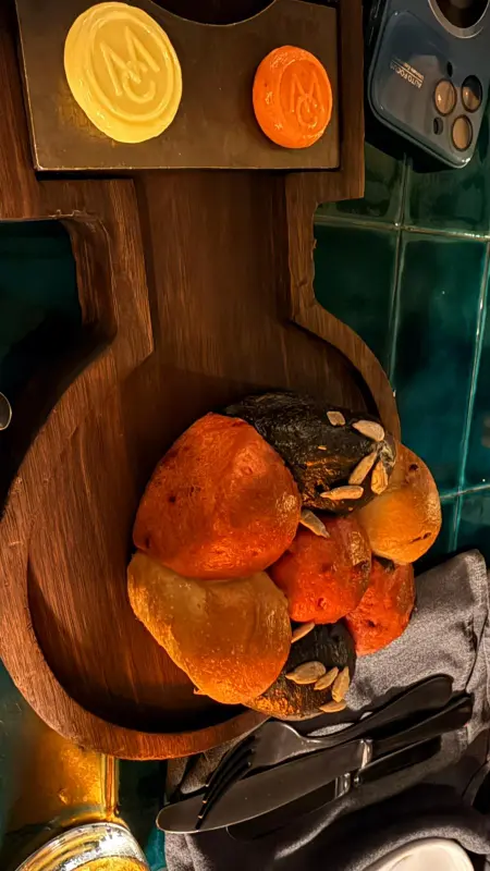 The Meat Co.의 식전빵은 부드럽고 촉촉하며, 다양한 종류가 제공됩니다.