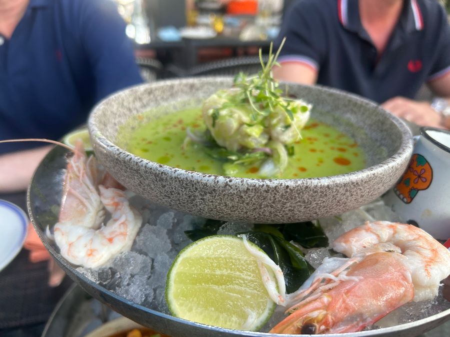 특히, 신선한 해산물로 만든 세비체는 마야의 대표적인 스타터 중 하나입니다. 초록색 소스에 담겨 나온 세비체는 새콤달콤한 맛과 함께 입안 가득 퍼지는 신선함이 일품입니다. 옆에는 통통한 새우와 나초, 그리고 독특한 맛의 소스들이 함께 제공되어 다채로운 맛의 조화를 이룹니다. 이 모든 것이 얼음 위에 시원하게 놓여 있어, 뜨거운 두바이의 날씨 속에서 한 줄기 오아시스 같은 시원함을 선사합니다.