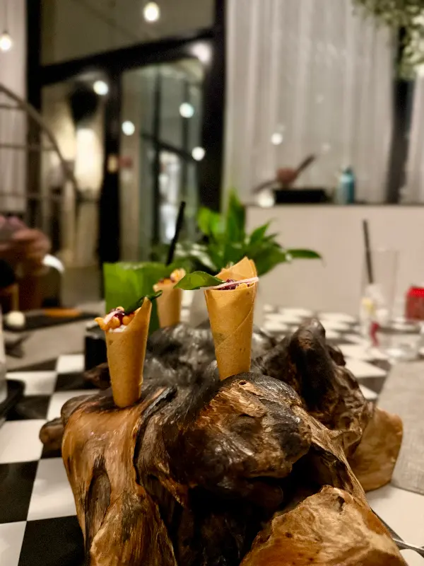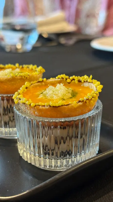 자리에 앉자마자 제공된 아뮤즈 부쉬는 앞으로 펼쳐질 미식 경험에 대한 기대감을 한껏 높였습니다. 특히, 앙증맞은 콘 모양의 아뮤즈 부쉬는 마치 예술 작품을 감상하는 듯한 기분을 선사했습니다. 은은한 조명 아래, 테이블 위에는 섬세하게 세팅된 식기들이 놓여 있었고, 잔잔한 배경 음악은 아늑한 분위기를 더했습니다. 이곳에서는 180 AED에 4코스 고급 식사를 즐길 수 있는 비즈니스 런치 세트를 맛볼 수 있습니다.