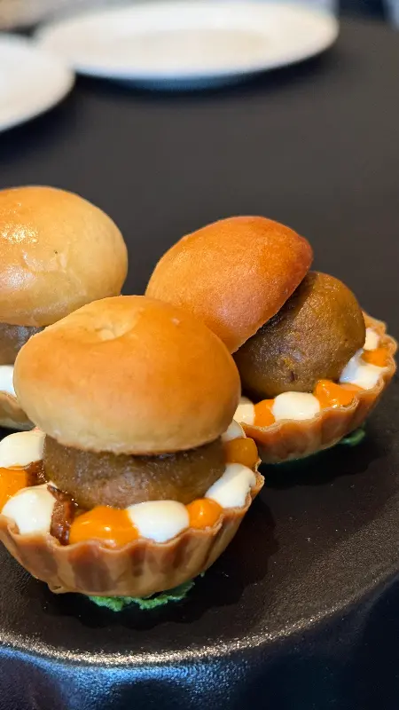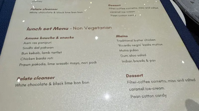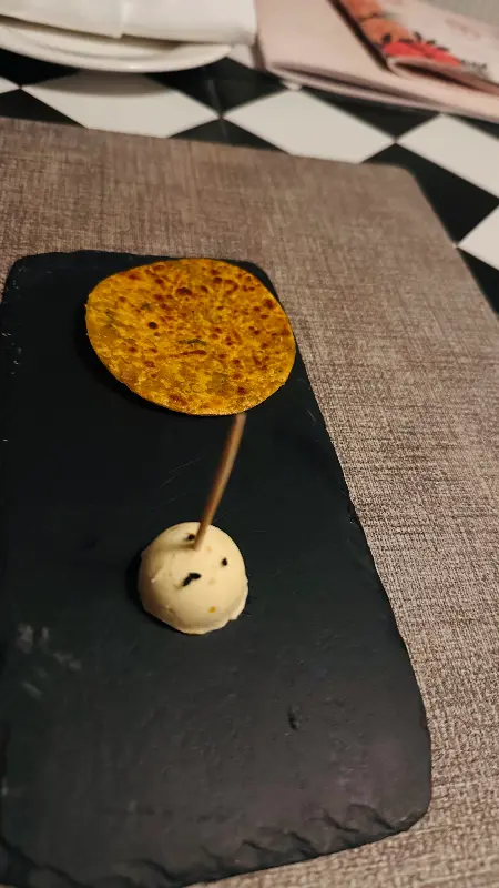 식사가 시작됨과 동시에 상큼한 암 라스 파니 푸리, 라임 와사비 마요네즈를 곁들인 바삭한 새우 파코다, 분 케밥 등 다양한 아뮤즈 부쉬와 스낵이 테이블 위를 가득 채웠습니다. 암 라스 파니 푸리는 입안에서 톡톡 터지는 신선함이 일품이었고, 새우 파코다는 바삭한 식감과 라임 와사비 마요네즈의 조화가 훌륭했습니다. 분 케밥은 부드러운 빵과 케밥의 풍미가 어우러져 입맛을 돋우는 역할을 했습니다.