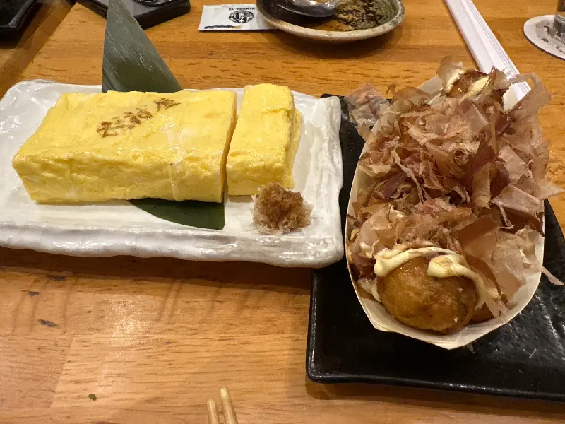 윤기가 자르르 흐르는 타마고야끼와 가쓰오부시가 듬뿍 올려진 타코야끼의 환상적인 만남.