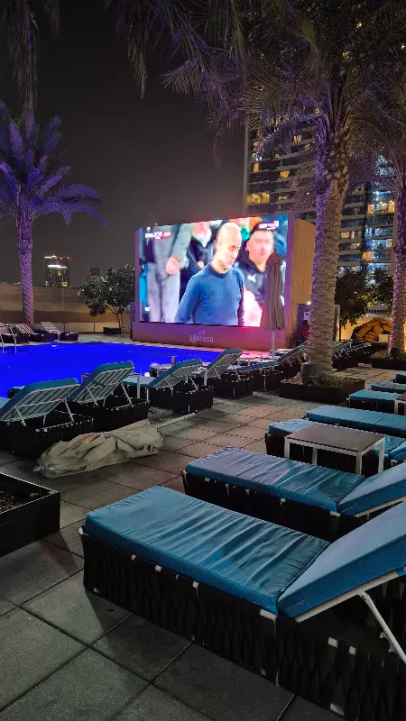 레스토랑에 들어서자마자 눈에 들어오는 것은 바로 수영장 뷰였습니다. 넓게 펼쳐진 수영장과 그 옆에 설치된 대형 LED 스크린은 시각적인 즐거움을 더하며, 식사 시간을 더욱 특별하게 만들어 줍니다. 특히 저녁 시간에는 스크린을 통해 상영되는 영상들이 분위기를 한층 고조시켜, 잊지 못할 추억을 선사합니다.