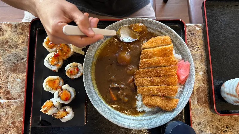 카츠카레와 롤의 조합. 롤 위에 뿌려진 소스가 식욕을 자극한다.
