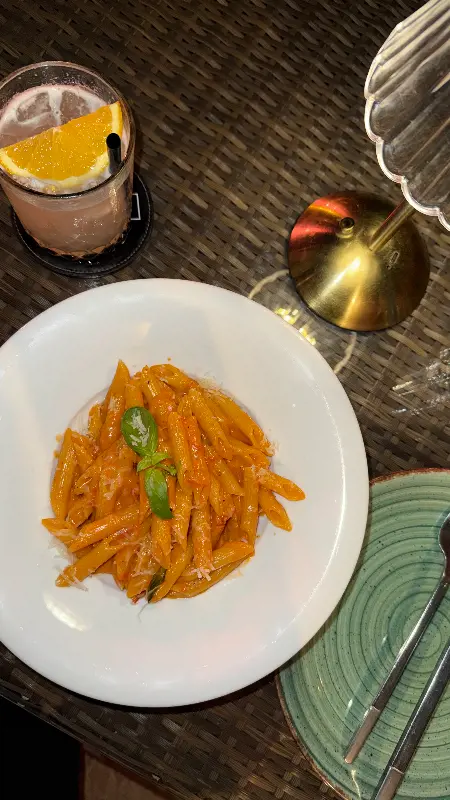특히 눈길을 끈 것은 핑크 소스 파스타였다. Waleed라는 직원이 적극 추천하기도 했고, 핑크빛 비주얼이 왠지 모르게 끌렸다. 잠시 고민 끝에 핑크 소스 파스타와 함께 치킨 타코, 그리고 시그니처 칵테일을 주문했다. 주문 후 레스토랑을 둘러보니, 아름답게 디자인된 야외 공간이 눈에 들어왔다. 은은한 조명과 함께 도심 속에서 휴식을 취할 수 있는 완벽한 공간이었다.