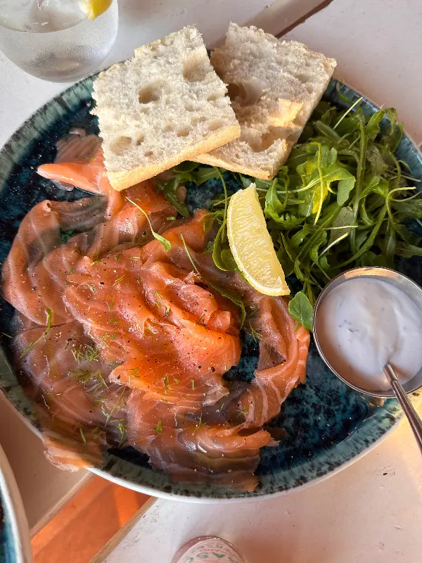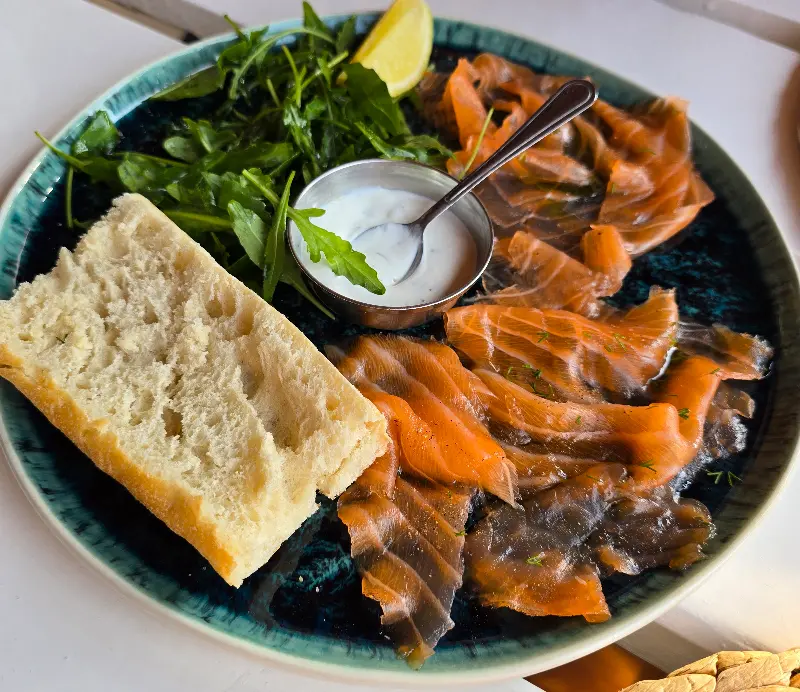 훈제 연어는 짜지 않고 사워도우와 함께 제공되어 신선한 굴과 환상적인 궁합을 자랑합니다.