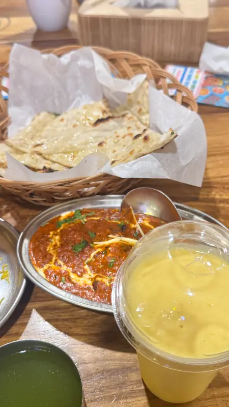 메뉴판을 펼치니 난생 처음 보는 인도 요리 이름들이 가득했습니다. 당황한 것도 잠시, 친절한 직원분이 메뉴 하나하나를 자세히 설명해주시고, 취향에 맞는 메뉴를 추천해주셨습니다. 직원분의 추천을 받아 주문한 음식은 Puri, 치킨 요리, 그리고 망고 라씨. Puri는 바삭하면서도 고소했고, 치킨은 부드러운 육질에 매콤한 향신료가 어우러져 환상적인 맛을 자랑했습니다. 특히 망고 라씨는 달콤하면서도 상큼한 맛이 일품이었는데, 더운 두바이 날씨에 지친 몸과 마음에 청량감을 선사했습니다.