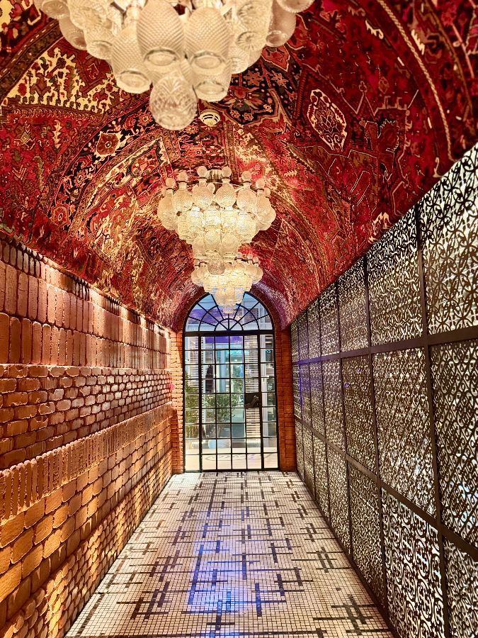 알마에 들어서는 순간, 마치 다른 세계로 이동하는 듯한 느낌을 받게 된다. 붉은 벽돌과 섬세한 격자무늬 장식이 조화를 이루는 복도는 몽환적인 분위기를 자아낸다. 천장에 매달린 화려한 샹들리에 조명이 공간을 은은하게 밝히며, 발걸음을 옮길 때마다 새로운 아름다움이 펼쳐진다.