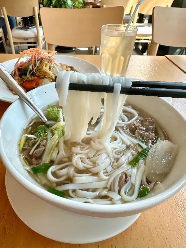 드디어 기다리고 기다리던 쌀국수가 나왔다. 뜨끈한 김이 테이블 위로 퍼져 나갔다. 뽀얀 국물 위로 얹어진 신선한 야채와 고기가 식욕을 자극했다. 젓가락으로 면을 들어 올리니, 쫄깃함이 그대로 느껴졌다. 국물 한 모금을 맛보는 순간, 감탄사가 절로 나왔다. 깊고 풍부한 육수의 맛이 입안 가득 퍼져 나갔다. 은은한 향신료의 풍미와 신선한 야채의 아삭함이 어우러져 완벽한 조화를 이루었다. 면발은 어찌나 쫄깃하던지, 먹는 내내 즐거움이 끊이지 않았다.