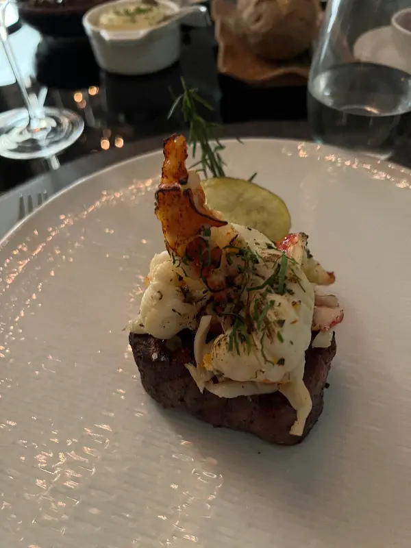 이어서 나온 크랩 케이크는 튀기지 않고 바삭하게 구워내어 느끼함 없이 담백한 맛을 자랑했다. 신선한 게살이 입안 가득 퍼지는 풍미는 훌륭한 칵테일과 환상적인 조화를 이루었다. 곁들여진 소스와의 궁합 또한 완벽했다. 사진에서 보이는 것처럼, 겉은 바삭하고 속은 촉촉한 완벽한 식감을 자랑한다.