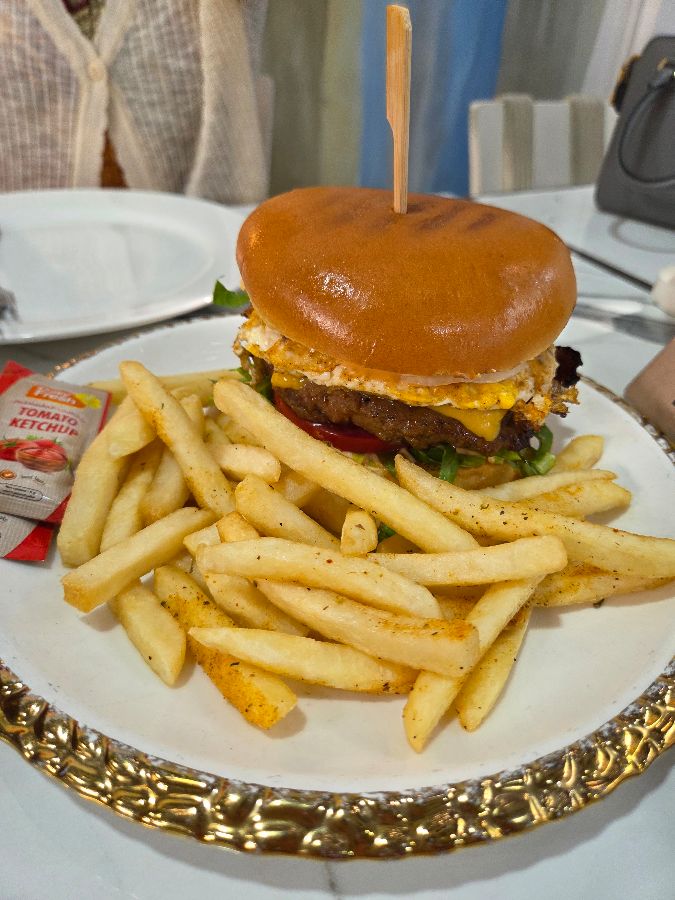바삭한 감자튀김과 함께 제공되는 낙타 고기 버거. 먹음직스러운 패티와 신선한 채소가 조화를 이룹니다.