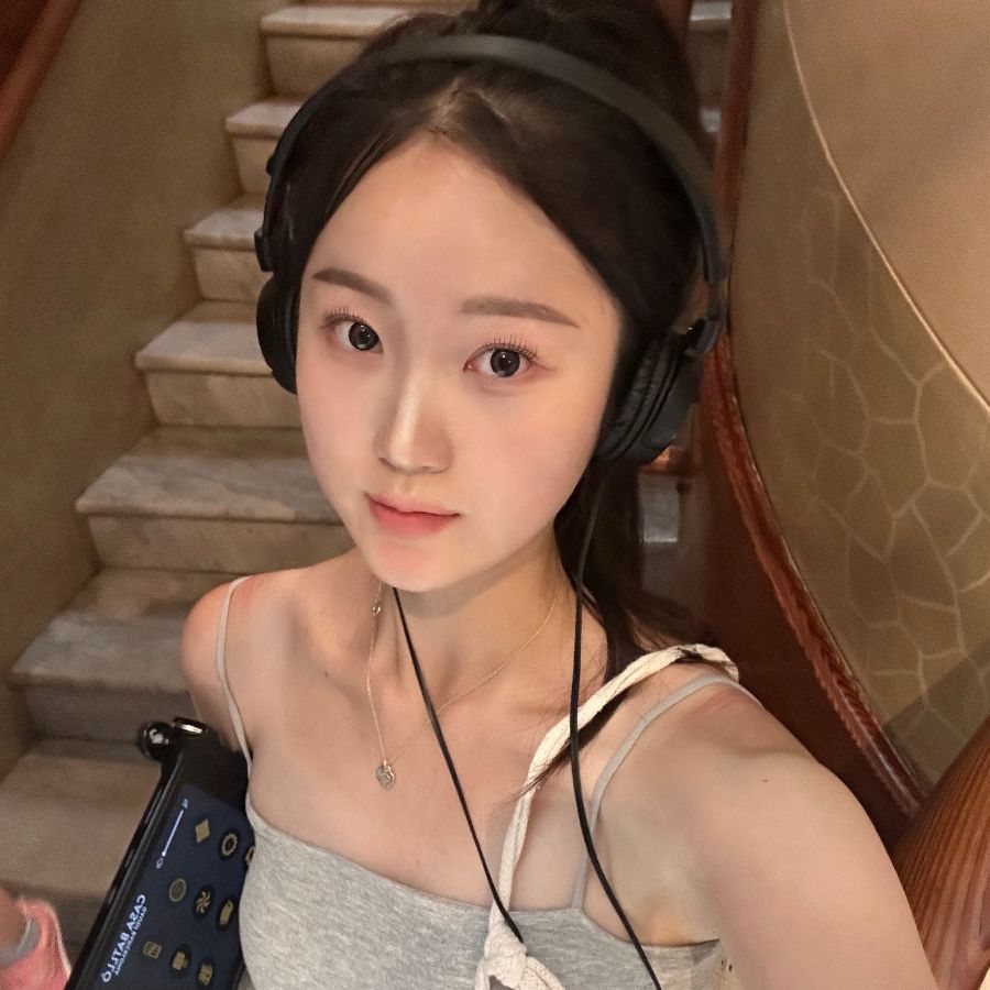 헤드셋을 착용한 채 카메라를 응시하는 방문객의 모습입니다. 캐주얼하고 편안한 분위기가 느껴집니다.