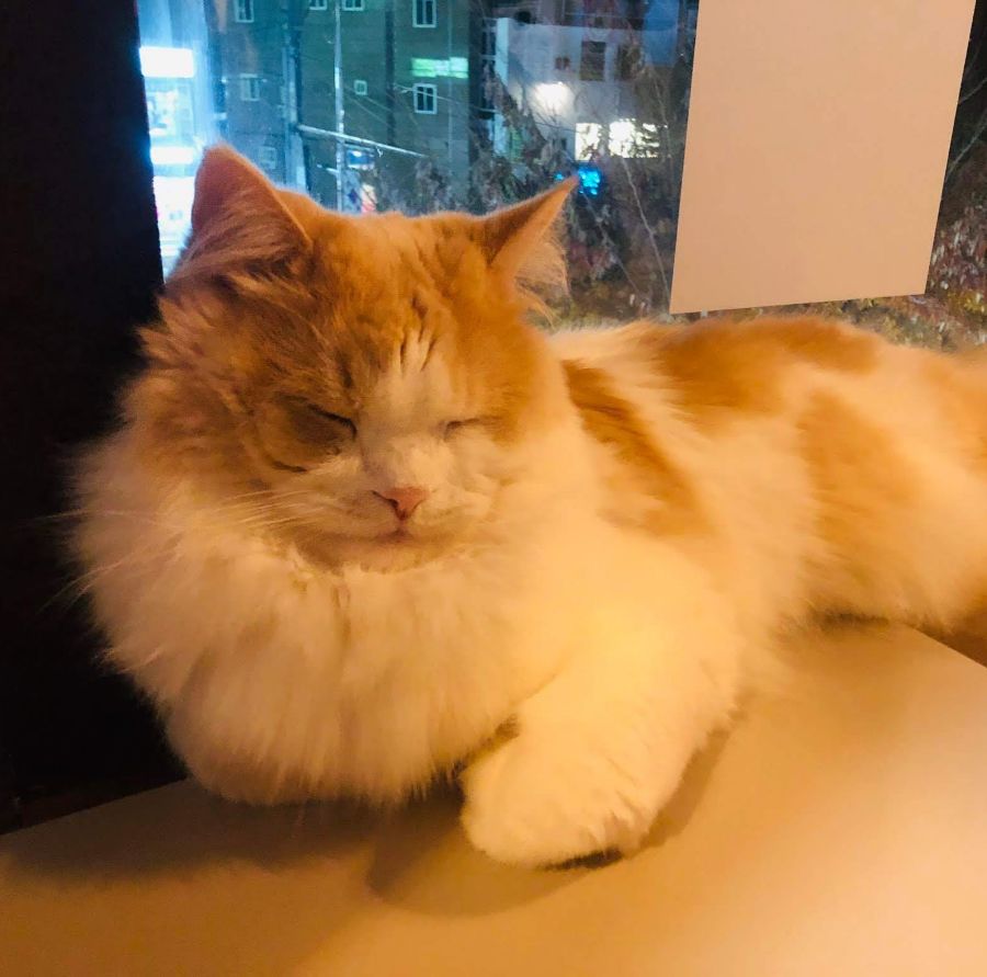 창가에서 편안하게 잠든 고양이의 모습. 평화롭고 따뜻한 레스토랑의 분위기를 엿볼 수 있습니다.