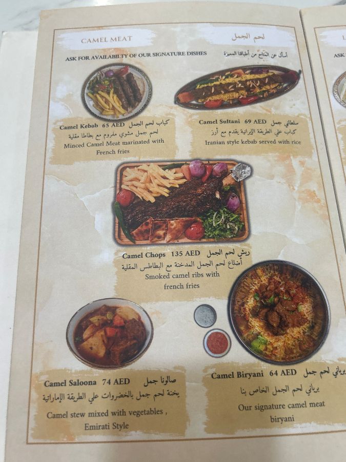 메뉴판에 시그니처 요리와 가격이 상세하게 안내되어 있습니다. 낙타 요리가 눈에 띄네요.