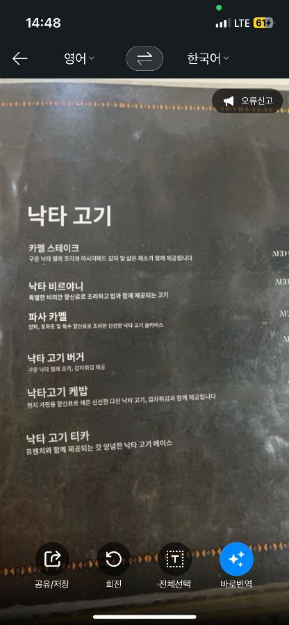 낙타 케밥, 낙타 스테이크, 낙타 찹, 낙타 스튜, 그리고 시그니처 낙타 고기 비리야니 등 다양한 낙타 고기 메뉴가 돋보이는 메뉴판입니다.