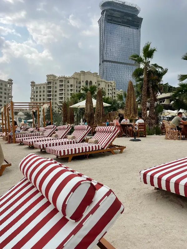 레스토랑에 들어서는 순간, 눈앞에 펼쳐진 풍경에 감탄하지 않을 수 없었습니다. 드넓은 백사장과 푸른 바다가 펼쳐지고, 그 위로 웅장한 건물이 하늘을 향해 솟아오른 모습은 한 폭의 그림 같았습니다. 붉은색과 흰색 스트라이프 패턴의 고급스러운 선베드들이 해변을 따라 정렬되어 있었는데, 그 모습은 마치 영화 속 한 장면 같았습니다.