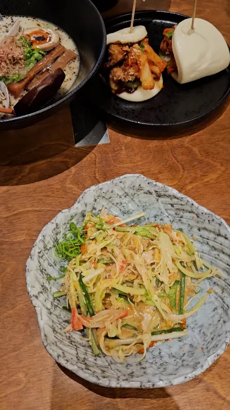 저희는 치킨까스 바이트와 함께 세 종류의 라멘, 즉 쇼유, 매운 된장 탄탄, 훈제 시오 다시를 주문했습니다. 잠시 후, 따뜻한 김이 피어오르는 라멘이 테이블에 놓였습니다.