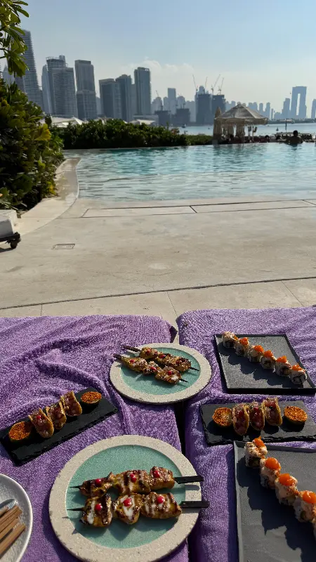 풀 사이드에서 즐기는 니케이 요리의 향연. 아름다운 플레이팅이 눈길을 사로잡는다.