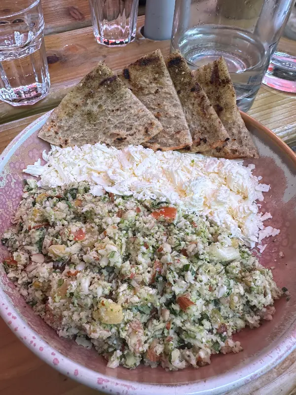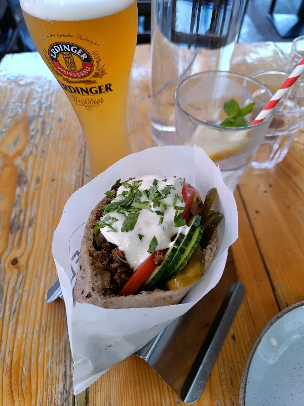 메제 플래터를 순식간에 해치우고, 아라예스를 맛볼 차례가 왔습니다. 아라예스는 겉은 바삭하고 속은 촉촉한 빵 안에 다진 고기가 가득 들어 있는 중동 요리입니다. 쇼크의 아라예스는 특히 도우가 정말 바삭해서 마치 버거를 먹는 듯한 느낌을 주었습니다.