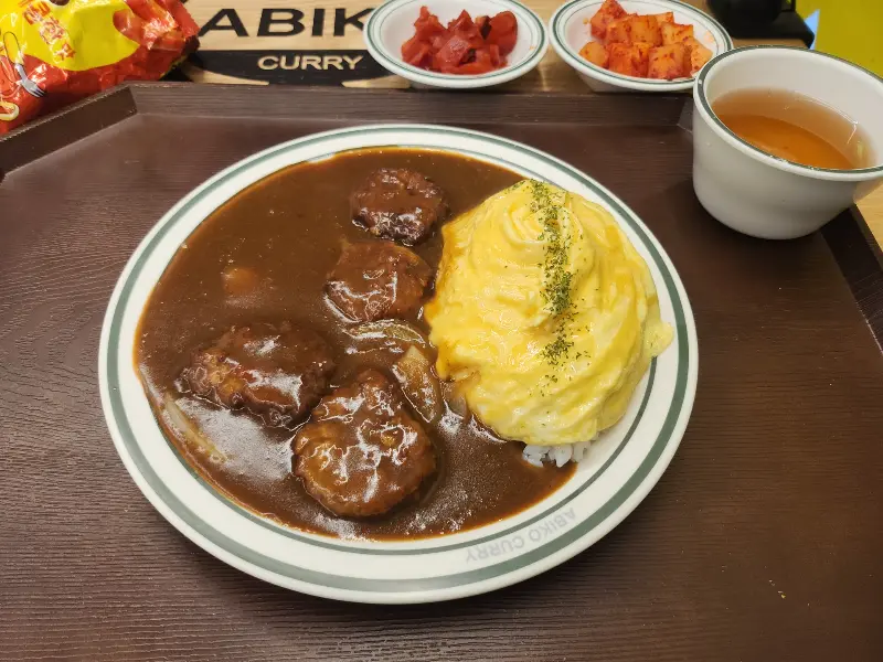 주문 후 얼마 지나지 않아, 따끈한 카레가 눈 앞에 놓였다. 윤기가 자르르 흐르는 카레와 촉촉한 오므라이스, 큼지막한 함박 스테이크의 조화가 먹음직스러웠다. 아비꼬의 또 다른 장점은 카레와 밥을 리필해준다는 점이다. 든든하게 배를 채울 수 있어서 정말 좋다.