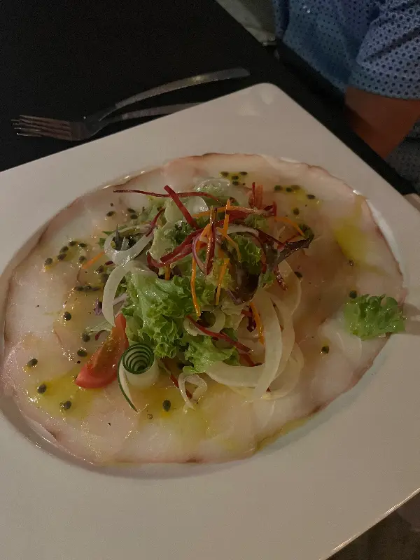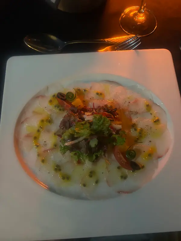 메뉴를 펼쳐보니, 다양한 세계 각국의 요리들이 눈길을 사로잡았습니다. 크리올 요리에서 영감을 받은 독특한 메뉴들도 있어 더욱 기대감을 높였습니다. 고민 끝에 펜넬과 패션프루츠를 곁들인 도미 카르파초, 지중해식 샐러드, 생선 수프, 야채 리조또, 그리고 콤바바의 대표 메뉴인 소고기 안심 스테이크를 주문했습니다.