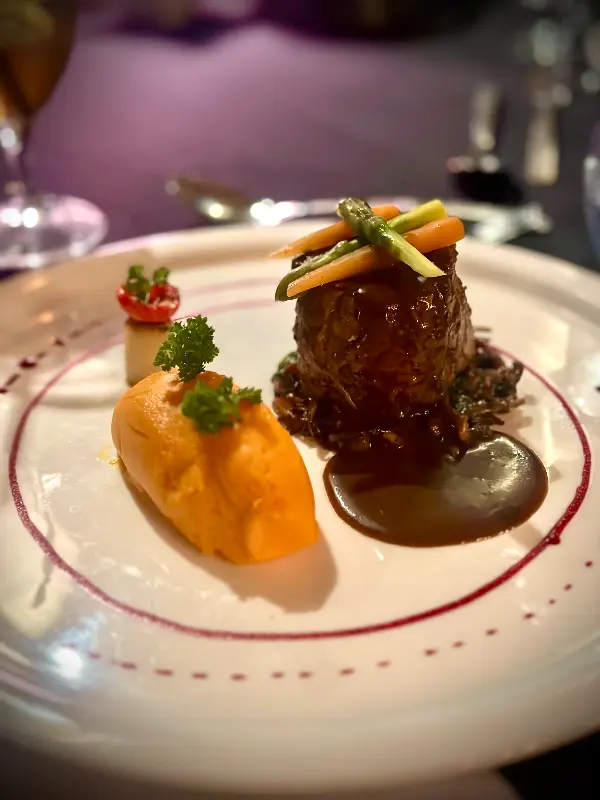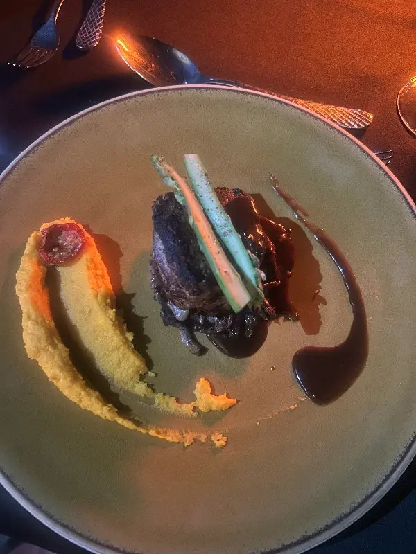 드디어 기다리고 기다리던 소고기 안심 스테이크가 등장했습니다. 윤기가 흐르는 스테이크 위에 아스파라거스와 소스가 아름답게 플레이팅되어 있었습니다. 칼로 스테이크를 자르는 순간, 부드럽게 잘리는 느낌이 완벽한 굽기를 짐작하게 했습니다.