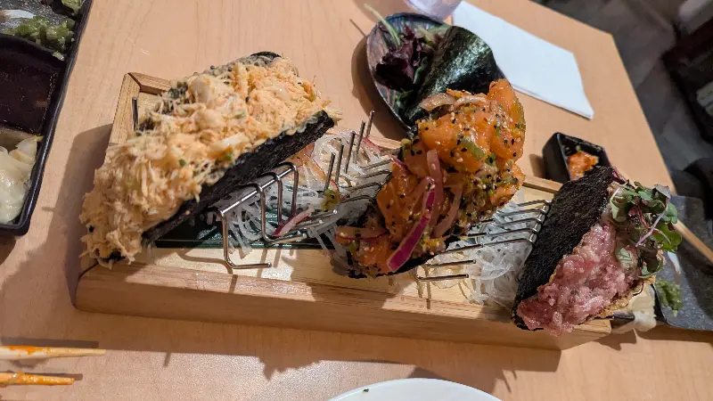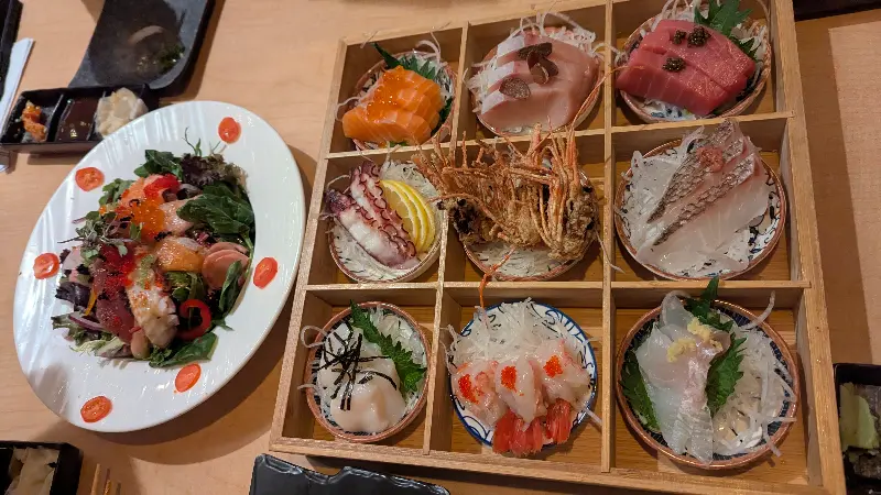 특히 모듬 사시미는 신선한 해산물의 향연이었다. 도톰하게 썰린 참치, 연어, 광어는 입 안에서 살살 녹아내렸다. 싱싱한 새우는 탱글탱글한 식감이 일품이었고, 쌉싸름한 시소 잎은 풍미를 더했다. 마치 바다를 통째로 옮겨 놓은 듯한 신선함은, 라스베가스에서 경험하는 최고의 맛이었다. 곁들여 나온 따뜻한 미소 된장국은, 쌀쌀한 날씨에 언 몸을 녹여주는 듯했다.